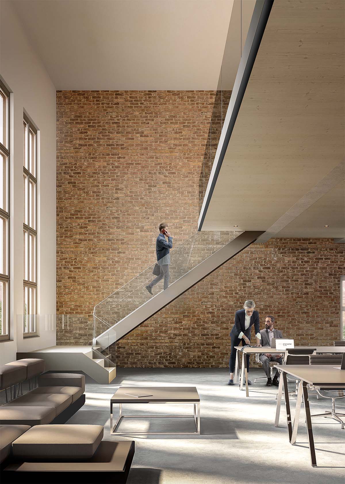 Jetzt wird die Idee eines inspirierenden Arbeitsortes neu belebt: New Work zieht ein, wo einst Fasern gesponnen wurden. Historische Substanz trifft auf Glas, hohe Decken, moderne Ausbauten und begrünte Höfe. Die Manufaktur von einst wird zum Ort für Zukunft, Komfort und Nachhaltigkeit.